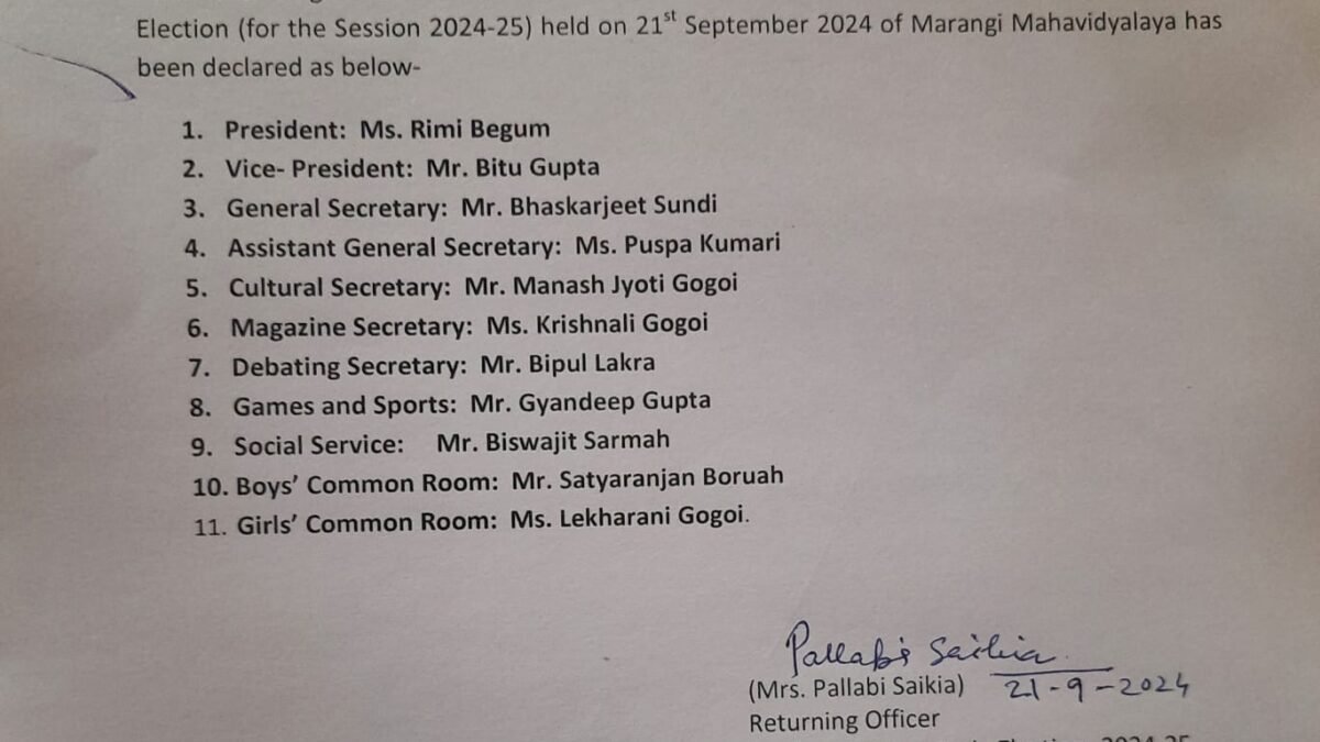 Results of the online Speech Competition ,which is held on the occasion on 35th foundation day of Marangi Mahavidyalaya.August 23, 2024Students Union Election 2024-25September 25, 2024 Election results Share Related postsApril 4, 2025Group Discussion of the 2nd Semester minor and 4th semester minor , department of Education on 4.4.25Read moreApril 3, 2025The NSS unit of Marangi Mahavidyalaya Organised an art competition for the students of Gidi Basti LP School. This event was likely part of the NSS community outreach and engagement initiatives, aimed at promoting creativity and self-expression among local school children.Read moreApril 2, 2025NSS Special camp -2025 Day 2 : plantation program Venue: Gidi Basti LP SchoolRead more